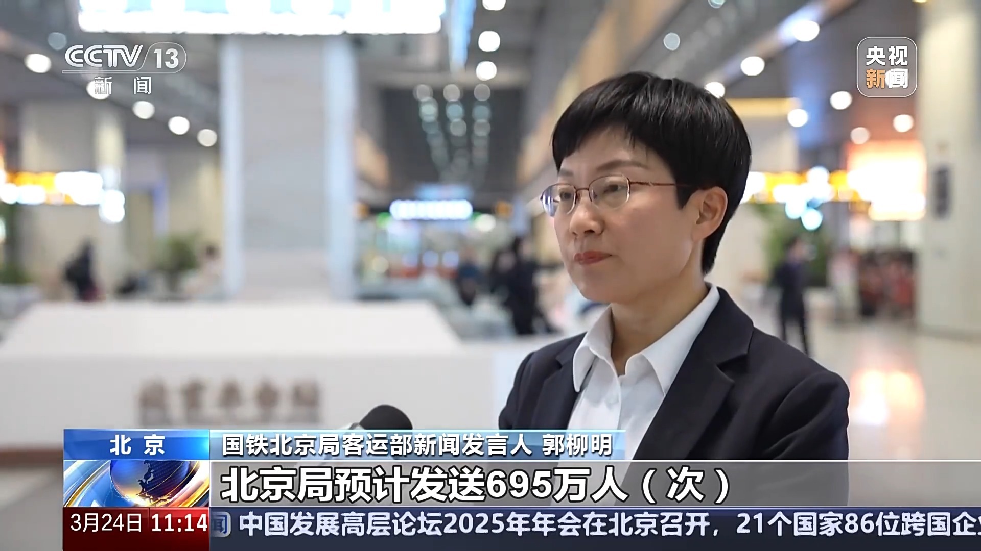 国铁北京局客运部新闻发言人 郭柳明:清明运输期间5天,北京局预计发送695万人次,同比增幅4.6%。高峰日在4月4日,预计发送165万人次。客流主要集中在济南、太原、郑州、沈阳、青岛、西安以及北京至天津、保定、石家庄、张家口往返间。